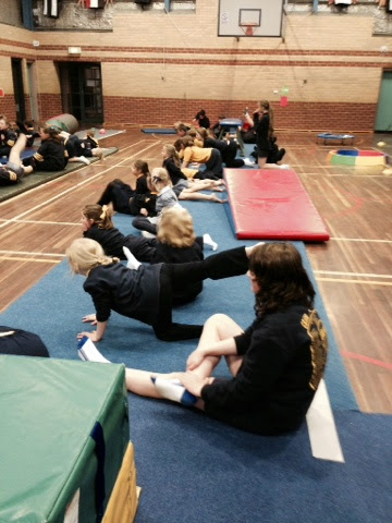 Th older students act as coaches and take notes, use iPads to show how our gymnastics moves look and help to correct our moves.